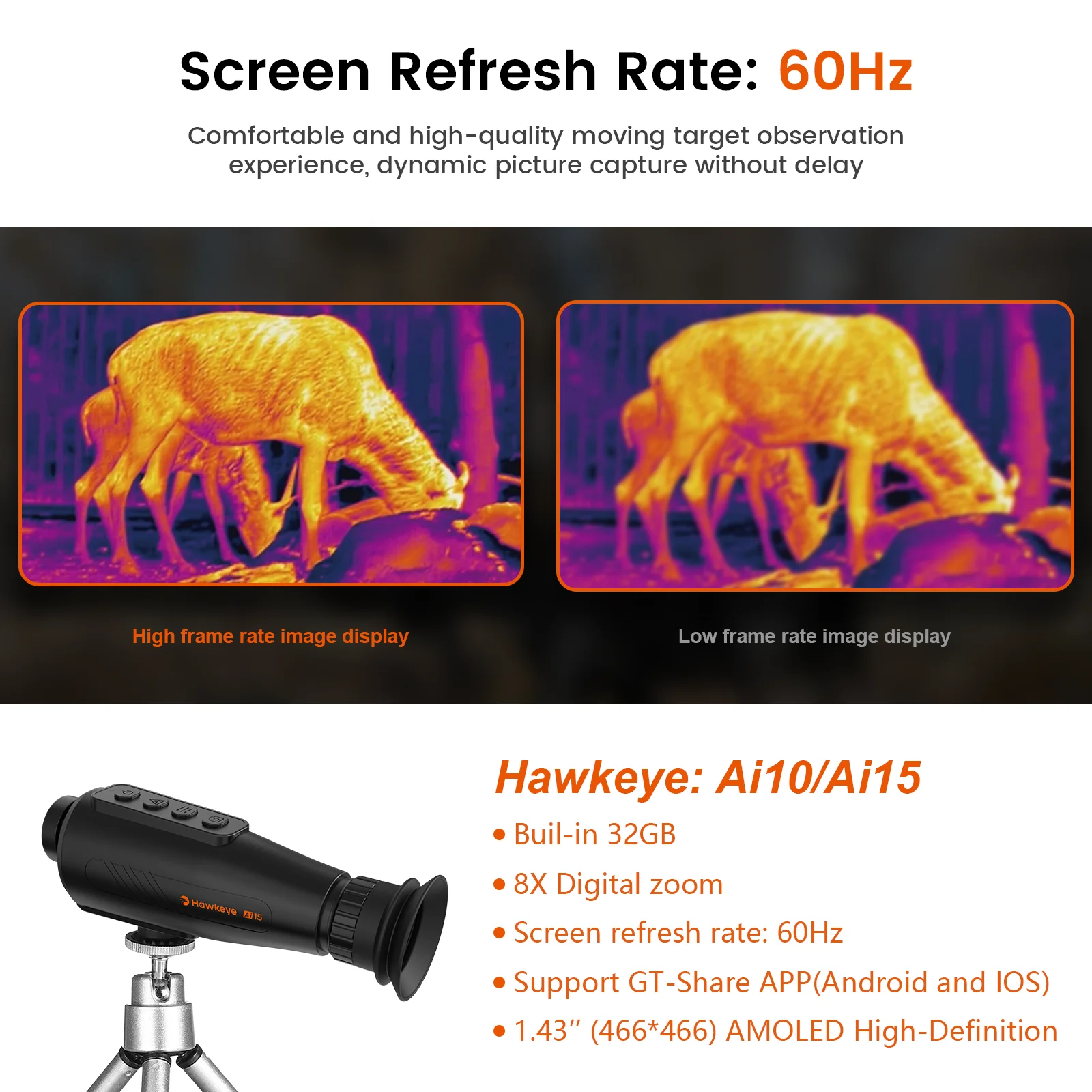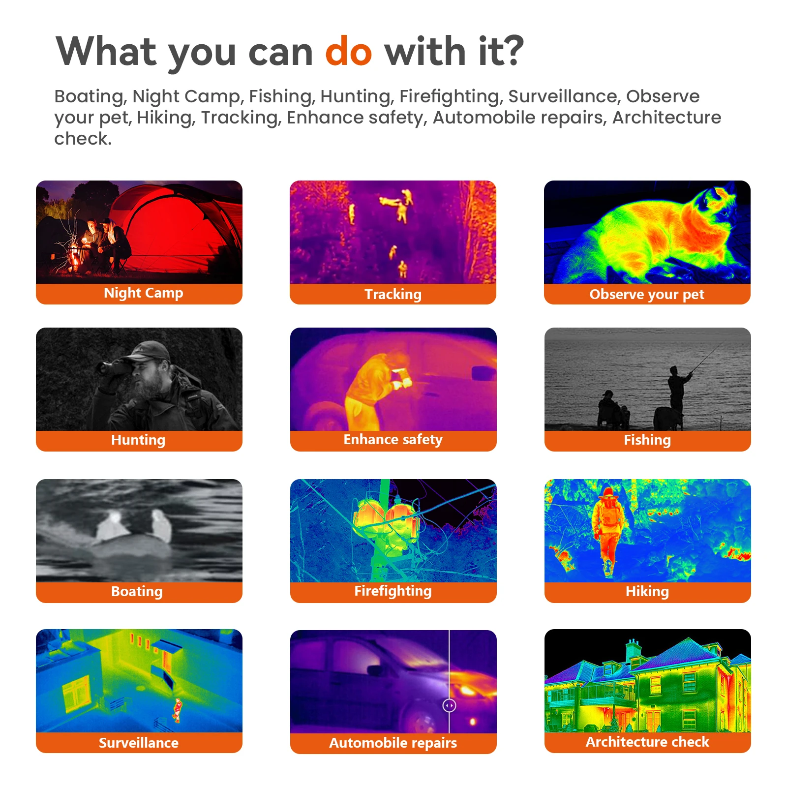 The Hawkeye Ai10/Ai15 thermal Monocular uses the latest infrared imaging technology to detect the tiniest temperature differences of natural and man-made objects, which allows users to see in full darkness, smoke, and low-visibility, low-contrast conditions. Boating, Camping, Fishing, Hunting, Firefighting, Surveillance, Observe your pet, Hiking, Tracking, Enhance safety, Automobrepairs, Architecture check, UFO searching and even star gazing