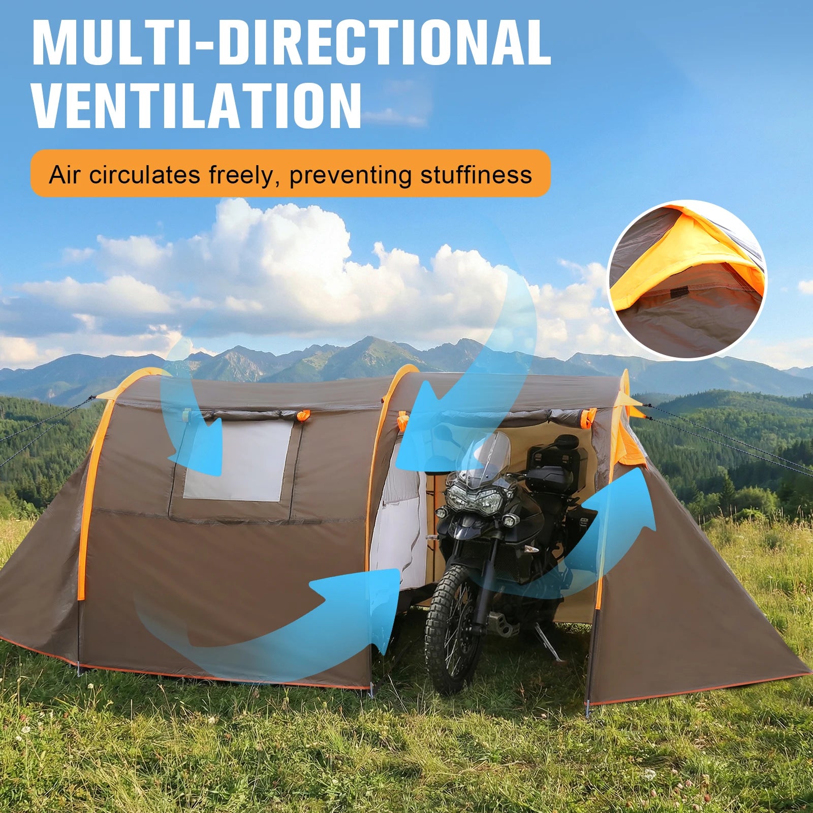 Features: 1.Spacious Interior: This bikepacking tent offers an impressive space with overall dimensions of 181.1x86.61x62.99 inches, ideal for family backpacking trips. It easily accommodates motorcycles, camping gear, or accessories for a comfortable outdoor experience. 2.Superior Protection: Built as a versatile backpacking tent, the 210T polyester fabric and 3000mm waterproof PU coating, along with sealed seams, ensure reliable weather protection and keep you dry during unpredictable outdoor elements. 3.Excellent Ventilation Design: As a 4 season tent, it features two front doors in the vestibule area and two ventilation windows to enhance airflow and reduce stuffiness inside. Great for long stays in diverse weather conditions. 4.Lightweight and Portable: This lightweight tent is designed for travel with a packing size of just 24x13 inches. The included carry bag makes transport easy, ensuring you're ready for any adventure without feeling burdened. 5.Effortless Setup: Our waterproof tent boasts a quick-setup design, usually requiring minimal effort. With clear instructions, two people can easily assemble this double-layer tent in just 5-10 minutes, streamlining your camping trip. Specification: Product Size: 181.1x86.61x62.99inch Brand: None Origin: Mainland China Material: Oxford cloth + Fiberglass strut
